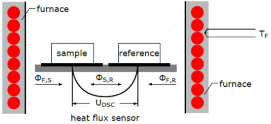 Schematics of a heat flow differential scanning calorimetry (DSC) with a disc-type sensor and illustrated heat flow paths.