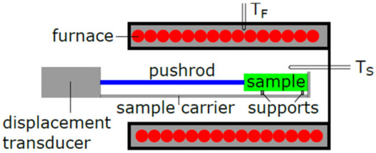 In this work a NETZSCH DIL 402 C (NETZSCH-Gerätebau GmbH, Selb, Germany) ( Figure 7) with a SiC furnace (Tmax = 1600 °C) with an alumina sample holder, push rod, and sample carrier was used. This system had a measuring range of 5 mm and the linear variable displacement transformer (LVDT) was based on electromagnetic induction and had a resolution of 1.25 nm per digit.