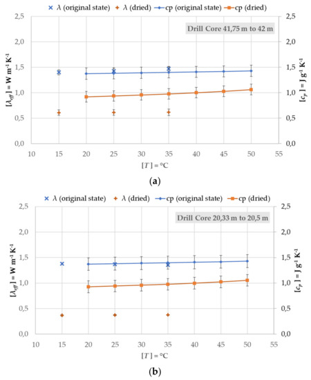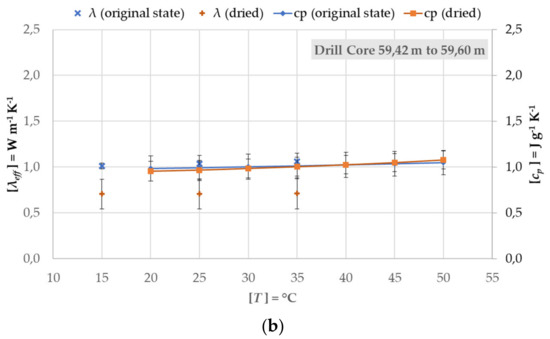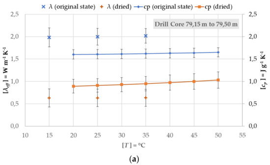 Figure 9 and Figure 10 represent the determined effective thermal conductivity and specific heat capacity results for the drill core segments in the moist and dry states at four different depths. The actual moisture of the sample had a great influence on both physical quantities. This difference is clearly visible in the measurements of the segments at 79.15–79.5 m and 59.42–59.6 m. The uncertainty bars show the combined expanded uncertainty of all sample measurements, including the device, calibration, and sample uncertainties. The largest influence of these uncertainties come from the samples themselves and are, therefore, very small in the measurement of the effective thermal conductivity at 22.33–20.5 m, since only one sample was available.