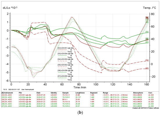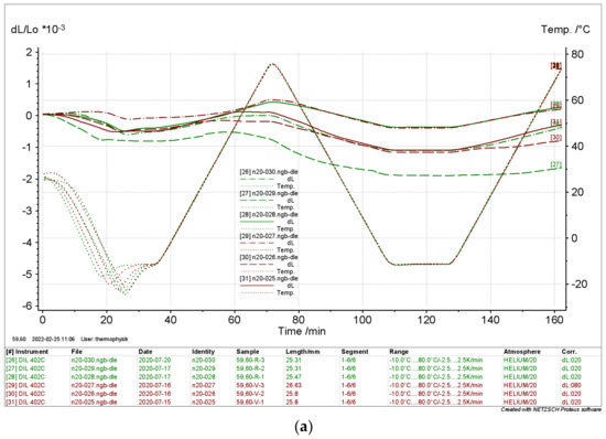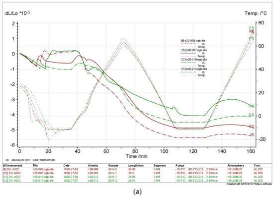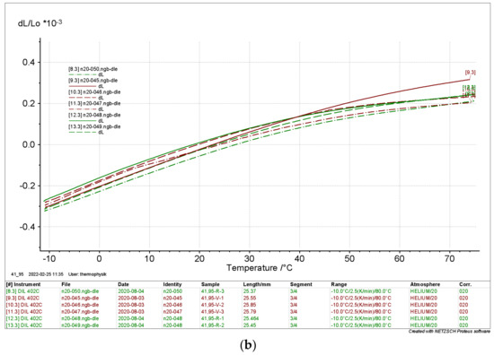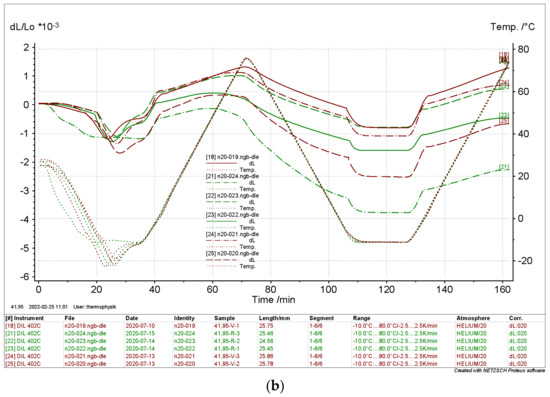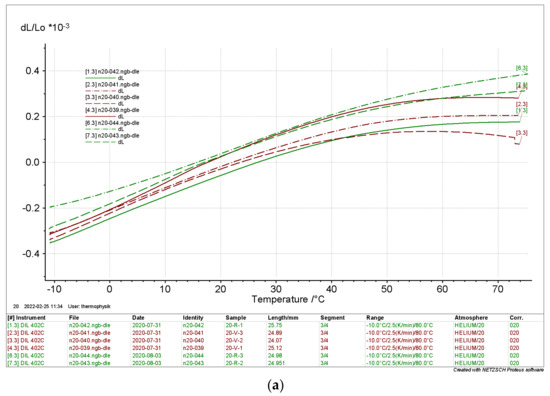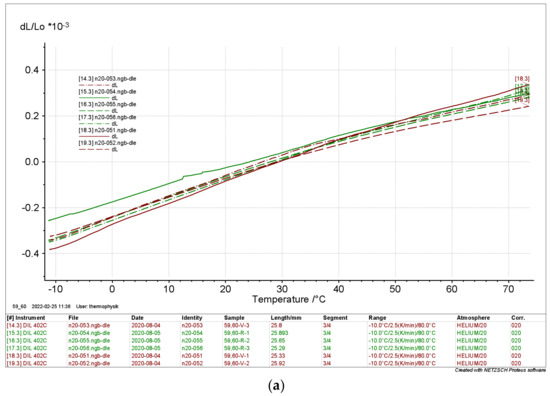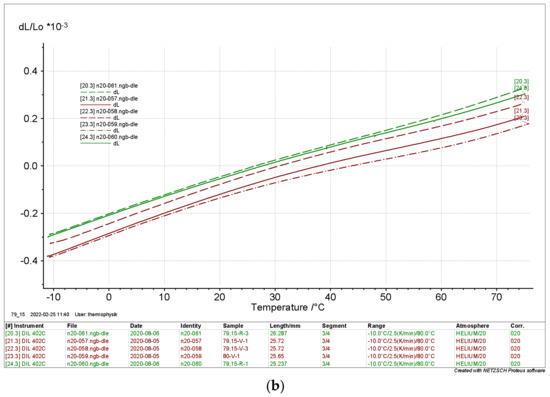 The results depicted in Figure 14 and Figure 15 clearly show that the relative length change of the dry samples differed significantly from the results of the moist samples. Again, there is no significant evidence of the directionality of the samples. The curves indicate a thermal expansion in the range of ΔL L0−1 ≈ 0.8 × 10−3 in a range from Tmin = −10 °C to Tmax = 80 °C. The moist samples differed considerably with ΔL L0−1 ≈ 2 × 10−3 to 6 × 10−3.