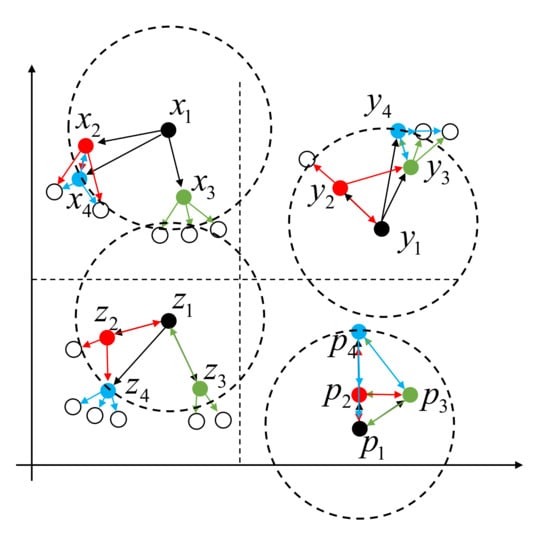 The MkNN of sample x can be defined by Equation (4). Given a sample x, if x has in its kNNs, should also have x in its kNNs [18]. According to the above definition, in Figure 1, , , and .