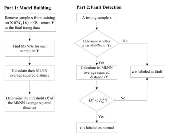 Before the model was established, outliers in the training set were eliminated by the MkNN method. This improves the data quality for modeling. In the fault detection stage, the relationship between samples was determined by looking for mutual nearest neighbors. If a test sample did not have mutual neighbors, this test sample was judged to be faulty. For test samples with mutual neighbors, the corresponding distance statistics were calculated to perform process monitoring. Compared with the kNN method, the proposed method uses more valuable and truthful information, improving fault detection performance. The flow chart of the proposed fault detection method is shown in Figure 2.