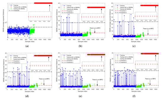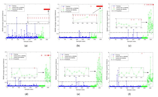 Fault detection results of FD-MkNN for fault 1 of TEP. (a) no outlier; (b) ; (c) ; (d) ; (e) ; (f) .