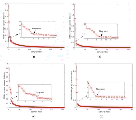 It can be observed from Figure 5 that, for outliers with mutual protection, the corresponding MkNN distance statistic is significantly larger than that of the normal training sample. Therefore, the elbow method [26] is used to eliminate outliers with mutual protection: first, arrange the MkNN distance statistics of the training samples in descending order, then determine all samples before the elbow position as outliers with mutual protection, and finally eliminate these outliers from the training set.