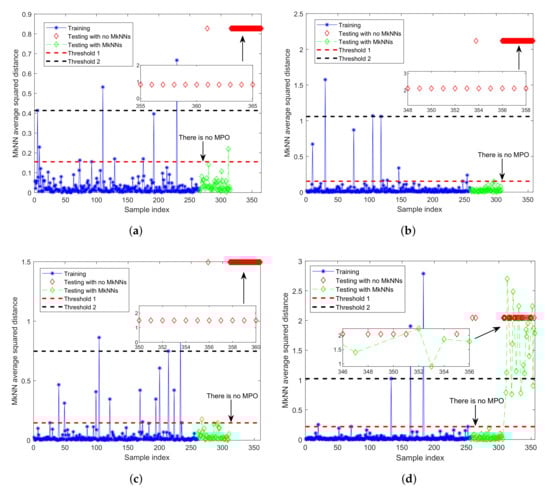 As shown in Figure 5, when two outliers are relatively close, an interesting phenomenon will appear: they will become each other’s mutual nearest neighbors. Therefore, the MkNN rule cannot identify them as outliers. For example, in Figure 5, , , and are protected by 1, 2, and 3 outliers, respectively. When the outliers far from the normal training samples are kept in the training set due to mutual protection, it will cause the threshold or control limit calculated in the training phase to deviate seriously from the average level. We call this phenomenon the “Mutual Protection of Outliers (MPO)”, which is also the main reason why the detection performance of the FD-MkNN method decreases when the proportion of outliers increases from 2% to 5%.
