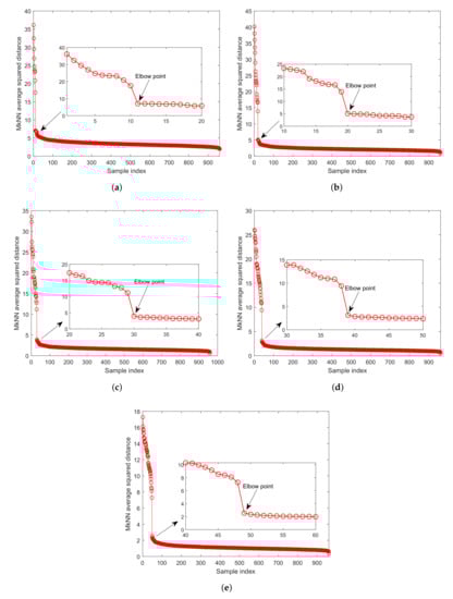 These three faults are chosen to demonstrate the effectiveness of the proposed method. The parameter k of FD-kNN is 3. The parameters and of FD-MkNN are 42 and 45, respectively. For the FD-MkNN method, the outliers with mutual protection phenomenon are first eliminated by the elbow method, as shown in Figure 9.