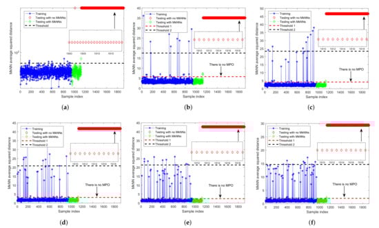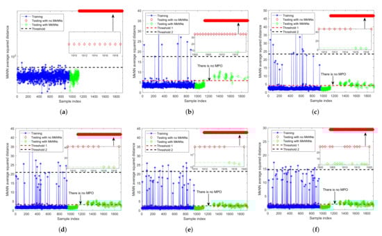 Fault detection results of FD-MkNN for fault 13 of TEP. (a) no outlier; (b) ; (c) ; (d) ; (e) ; (f) .