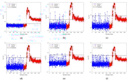 Fault detection results of FD-kNN for fault 13 of TEP. (a) no outlier; (b) ; (c) ; (d) ; (e) ; (f) .