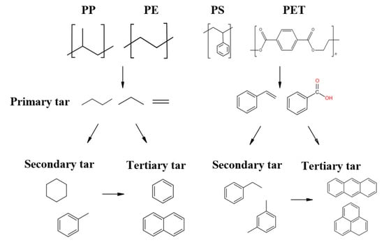 In addition, pyrolysis causes the melted plastic particles to tend to stick together and form clumps. In the case of MPW, the formation of tar depends on the nature of the polymer, as shown in Figure 2. Primary aromatic tar formation occurs only in the degradation of polymers, such as PS and PET, which already contain aromatic rings in their structure. For PP and PE, the volatiles and primary tar are composed of alkanes and olefins of different chain lengths. Components of primary tar usually have unstable properties and evolve into more stable structures, resulting in secondary and tertiary tars [18].