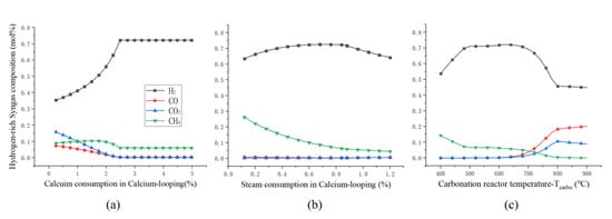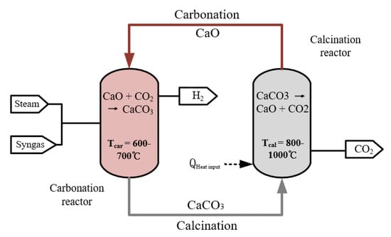 The calcium-looping (CaL) is a process regarding the reversible calcination reaction of carbonates. Natural calcium carbonate (CaCO3) is the raw material of the adsorbent, which can produce the porous active ingredient CaO after calcination. The high specific surface area CaO and CO2-rich syngas enter the carbonation reactor for gas–solid exothermic reaction [26] at 600–700 °C. The waste heat from the carbonation reactor can be used to generate high quality steam for the steam turbine and the H2-rich syngas is heat exchanged with a waste heat boiler. The carbonate reactor produces H2-rich syngas after absorption of CO2, which reduces the cost of purification. The generated CaCO3 mixed solid enters the calciner and decomposes to obtain high-purity CO2 and CaO. Calcium oxide enters the carbonation reactor for circulation and CO2 is compressed and trapped in the storage tank. The calcination reaction occurs at 800–1000 °C in a heat absorption reaction, in which the heat is supplied by combustion of the residual gas after separation of H2. However, it will reduce the cold gas efficiency (CGE) because part of the gas is used for combustion.