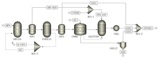 The simulation of the gasification unit consists of 11 modules, 15 stream and 4 energy streams. Four reactors are used to simulate drying, pyrolysis, combustion, and gasification. First, the DRYING simulates the drying process of waste plastics instantly entering the fluidized bed. The dried material is further pyrolyzed and the generated steam is used for subsequent reactions. Secondly, the PYROLYS simulates the cracking reaction of waste plastics in the dense-phase region, which breaks down and converts waste plastics into single-element molecules. At the same time, the non-conventional components are changed into conventional components. Thirdly, the COMBU represents the combustion of partial coke and tar in oxygen. Finally, the GASIFIER simulates the gasification process of waste plastics in the free board, where chemical reaction equilibrium and phase equilibrium are reached in the reactor based on Gibbs free energy minimum [29].