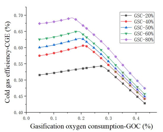 In order to observe the effect of steam dosage and oxygen dosage on the CGE, Figure 8 shows the effect of oxygen dosage on CGE at different steam dosage. At different steam dosage, the growth of oxygen quantity causes the CGE to first increase and then decrease sharply due to the excess oxygen that results in complete combustion of MPW. From the graph, it seems that the increase of steam dosage is beneficial to the improvement of cold gas efficiency.