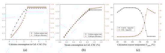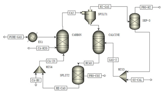 Figure 5 explains the process. The purity of the CO2 can reach 99% in the system. The operating temperature of the carbonation reactor is 630 °C and the temperature of the calciner is 950 °C. We set the supplemental limestone flow rate to 0.04 times of carbon dioxide discharge. The CO2 recirculation ratio is 0.6 where the release rate is 0.04 and the gas–solid separation efficiency is assumed to be 1 [27].