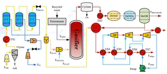 where represents the oxygen feed to the gasifier and represents the feed of MPW. represents the steam feed to the gasification section.