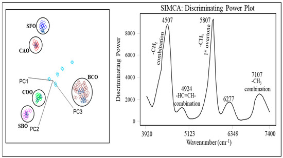To make the interpretation easier, the spectra were preprocessed using mean-centered and transformed using ‘normalize’ and ‘smooth’ (with a second-order poly-nominal filter with a 35-point window) that improves the spectral characteristics. Many transformation options such as first derivative, baseline correction, Multiplicative Scatter Correction (MSC), and Standard Normal Variate (SNV) were applied to the spectral data, but the best results were obtained by using normalized and smooth transforms. Those transforms were used for removing any variation in the absorbance spectra due to a variation of the light penetration between samples. SIMCA was used to create an algorithm for the classification of the oils. SIMCA 3D class projection was shown in Figure 1. Black cumin, canola, corn, soybean, and sunflower oils were clustered distinctly. The most important absorption peaks were found at 4507 cm−1 (-CH2 combination), 4924 cm−1 (-HC=CH- combination), 5807 cm−1 (-CH3 first overtone), and 7107 cm−1 (-CH3 combination). Peak identifications were made based on the literature [36].