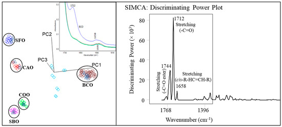The spectra were preprocessed using mean-centered and transformed using ‘smooth’ and ‘second derivative’ (with a second-order poly-nominal filter with a 35-point window). To identify small and nearby lying absorption peaks that were not resolved better in the unprocessed spectra, a transformation of the second derivative was used to increase the specificity of those peaks. Moreover, baseline errors can be removed by using second derivative spectra. Conversely to NIR data transformation, many options were used again to obtain the best output, and second derivative and smooth transforms gave the best classification. SIMCA 3D class projection was shown in Figure 2 Black cumin oils, canola, corn, soybean, and sunflower oils were clustered distinctly. Based on the discriminating power, the peaks at 1744 and 1712 cm−1 are associated with –C=O ester stretching of fatty acids (Figure 2). The peak at 1658 cm−1 was related to C=C stretching (cis-R-HC=CH-R) from polyunsaturated fatty acids. The peaks assignment was based on the previous reports [38,39]. Examining the spectra closely, there were sharp differences in the region between 1750 and 1640 cm−1. Between 1750 and 1700 cm−1, black cumin oils have two peaks, whereas the others revealed only one.