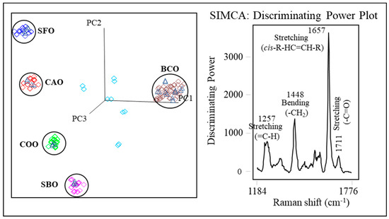 The spectra were preprocessed using mean-centered and transformed using ‘normalize’ and ‘smooth’ (with second-order poly-nominal filter with a 35-point window) to reduce the noise and improve spectral characteristics. Many options were used similar to NIR data transformation, and normalized and smooth transforms provided the best classification. Associated bands to the model (Figure 3) were found around 1257 cm−1 (stretching =CH-), 1448 cm−1 (bending -CH2), and 1657 cm−1 (stretching cis-R-HC=CH-R). The peak assignments were made based on the previous studies [11]. Those bands may be related to monounsaturated and polyunsaturated fatty acids, and a positive correlation could be observed as an increase in the band intensity increases the percentage of unsaturated fatty acids in oils similar to obtained from the FT-MIR SIMCA model. FT-MIR and Raman spectrometers are complementary techniques. For instance, the discriminating power of the peak at 1712 cm−1 was very high on the model obtained from FT-IR spectra, while Raman spectra showed very low power. On the contrary, the power of the peak at 1658 cm−1 was very low on the model of FT-IR spectra, while Raman spectra showed very high power. The SIMCA model showed its great potential in detecting the adulteration of black cumin oil with vegetable oils since the ICD values were over 8.7, indicating portable Raman spectrometer discriminated the samples distinctly.