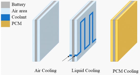 With the recent reinforcement of environmental regulations for internal combustion engines, more people are looking to eco-friendly electric vehicles (EVs) and hybrid electric vehicles (HEVs) [1,2]. For running an EV or HEV, a Li-ion battery system is essential. Because a series of chemical reactions occur during the use of the battery, heat generation inside the battery is unavoidable [3]. In particular, since the EV battery system has more prominent dynamic characteristics of heat generation than other battery systems, due to frequent load fluctuations, it is important to regulate the battery operating temperature consistently (20 °C to 40 °C) for stable vehicle performance [4]. In addition to performance degradation resulting from heat, the lifespan of a battery gradually decreases because of different factors, such as repeated charging and discharging, state of charge, current, and previous history, which is known as the “battery aging from use” [5,6]. Therefore, it is necessary to maintain the proper battery operating temperature, through a thermal management system, for the optimal performance and long-term durability of EVs [7,8]. Not all cylindrical batteries are applicable, but, generally, cylindrical batteries have a lower energy density than other types of battery, requiring more cells to generate high capacity, as well as extra space. Owing to such limitations, when battery cells are integrated in a narrow space, the temperature of each battery cell is higher, due to the limited air flow, than when a single cell is used [9]. Therefore, cylindrical battery cells have more spatial constraints than other types of battery cells. Battery cooling systems can be divided according to the method of heat exchange, including forced air cooling, forced water cooling, oil, other cooling methods, and phase change materials (PCMs), as shown in Figure 1 [10,11,12,13,14].