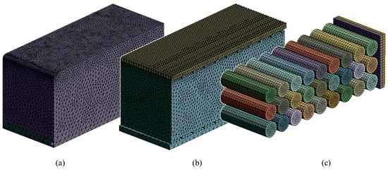 Configurations of CFD mesh: (a) battery pack case; (b) fluid area and exhaust heatsink; (c) battery cell and BMS.