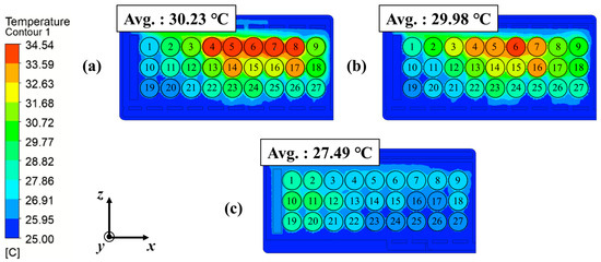 Figure 5 shows the simulation results of the battery pack designed in this study. Figure 5a shows the Z-type cooling model, Figure 5b shows the heatsink model, Figure 5c shows the spoiler-type model. A maximum temperature of 34.54 °C was observed for cell 7 in the Z-type model, and a maximum temperature of 33.76 °C was observed for cell 6 in the heatsink model. The heatsink and Z-type models had the same air flow amount and rate in the battery cells. For this reason, the Reynolds number was the same, as was the heat transfer coefficient inside the cells. However, because the addition of the heatsink model increases the area of heat transfer compared to the Z-type model, the heatsink model shows similar temperature distribution to that of the Z-type model, but the cooling effects for cells 4, 5, 6, 7, and 8 were improved. In Figure 5b, the temperatures of cells 15 and 16 of the Z-type model were lower than those of nearby cells. In general, the temperature of the central cell should be high because of the conduction between cells, but a large amount of air flows towards cells 15 and 16, resulting in more impact from convection than from conduction. A more detailed discussion is provided in Section 3.2.