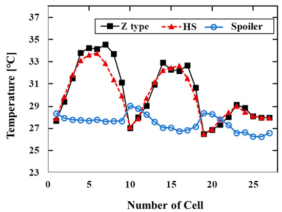 As shown in Figure 7c, the air flow changed between cells 25 and 26, when the spoiler was installed near the inlet. For the air flow distribution of the Z-type and heatsink models, the air flow between cells 14 and 17 was slower than 1 m/s, and little air flow was found. In the spoiler-type model, however, the maximum flow rate at the same location was 3.3 m/s, indicating that air flowed smoothly between the battery cells. This helped improve the uniformity of the battery pack temperature.