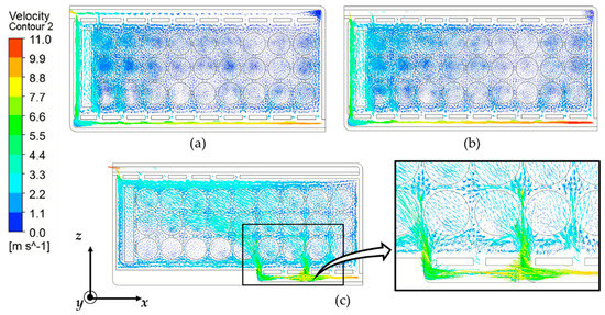 Velocity contours of airflow rate in the battery pack: (a) Z-type model; (b) heatsink model; (c) spoiler-type model.