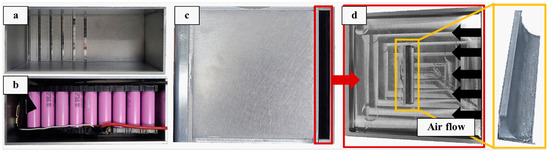 Schematics of the experimental system for the spoiler-type model: (a) inside the model; (b) schematic of assembled battery module; (c) outside the model; (d) with the spoiler at the inlet.