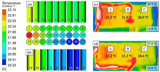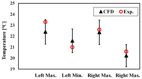 Figure 9 shows the results of testing the performance of the spoiler-type cooling system and the analysis results. The maximum and minimum values of the left and right sides of the battery pack were measured with an infrared camera, and these values were compared with the simulation results. For the temperature distribution, the simulation results were in line with the test results. The maximum and minimum values of the left and right sides shown in Figure 9a,b were compared with the experimental results Figure 9c,d to investigate the quantitative accuracy of the simulation results, and the results are shown in Figure 10. The error bar indicates a range of 5%.