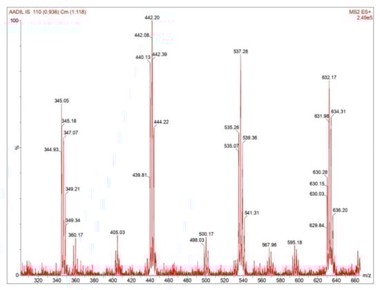 Mass spectrometric analyses were carried out using UPLC-MS/MS on XEVO TQ-S triple quadrupole mass spectrometer (Waters, Milford, MA, USA) operated using MassLynx software (version 4.1). The spectrometer was connected to an Acquity I-Class UPLC system (Waters, Milford, MA, USA). Chromatographic separation was carried out employing a gradient combination of solvent A (0.1% solution of HCOOH in water) and B (0.1% HCOOH in acetonitrile). Peptide chains were parted on an Acquity UPLC BEH Shield C18 column, 2.1 × 50 mm, 1.7 μm, (Waters, Milford, MA, USA) using a gradient B (5 to 33%) for a period of 10 min along with a flow rate of 0.3 mL/min at 40 °C. MS/MS data were obtained using electrospray ionization technique in positive mode and multiple reaction monitoring mode (MRM) was employed for the transition of selected peptides using a source, ion spray voltage of 3000 V, and a desolvation temperature ranging between 150 and 450 °C, respectively. The entrance potential was kept at 12 eV and cone voltage was maintained at 40 V.