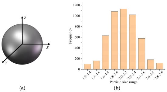 Since the selected urea particles are regularly shaped spherical particles, the geometric model of the urea particles is a spherical model (Figure 1a), and the size distribution properties of the model are parameterized based on the radius distribution of the urea particles in simulation tests. The particle size distribution of urea particles can be derived from the measured particle size, from which the mean and standard deviation are obtained. Figure 1b shows that the particle size distribution of urea particles is normally distributed, and its mean and standard deviation of particle size are 2.13 mm and 0.21 mm, respectively.