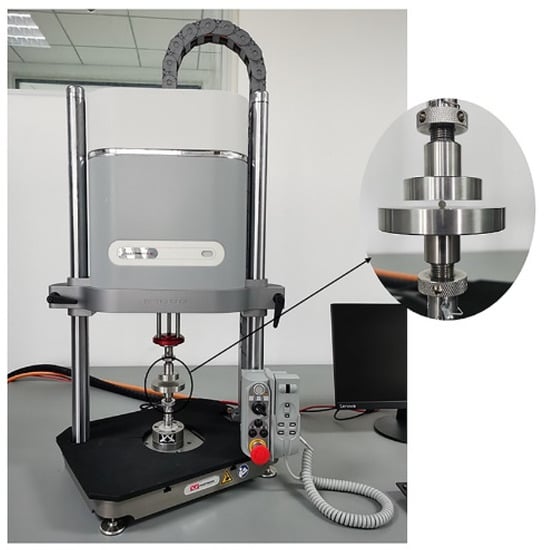 Poisson’s ratio and modulus of elasticity are important material property parameters, both of which can be measured and calculated using a universal material testing machine [18]. In this study, an E1000 universal material testing machine (Figure 2), manufactured by Instron, Norwood, MA, USA, was used for the compression tests.