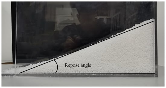 In this paper, the test was performed by the draw plate method. The room temperature was 23 ± 2 °C The physical repose angle measuring device was a PVC plastic box without a cover, and the box size was 200 mm × 100 mm × 100 mm. Urea particles (0.3 kg) were placed in the measuring device, and the measuring device-side baffle could slide upward. The test slowly lifted up the baffle, and the process of urea particles under the action of gravity to the opening slid down to be stable urea particles. The urea particle’s resting-state slope angle is its natural repose angle (Figure 7). The test was repeated 10 times, and the results of each test were photographed using a digital camera for further analysis.