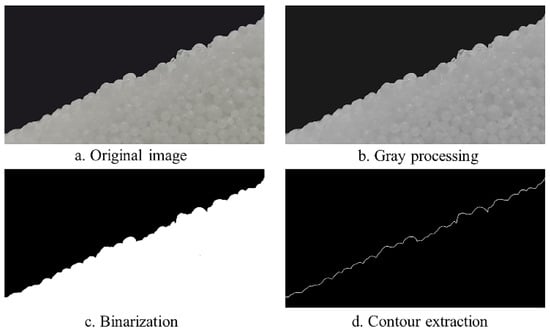 To reduce the measurement repose angle error, MATLAB 2018b (MathWorks, Inc. in the Natick, MA, USA) was used to read the particle stacking image, as shown in Figure 8, according to which the image was grayed out and binarized. Finally, the binarized image edge profile curve was extracted, the least-squares method was used to fit the profile curve to a straight line and the slope of the fitted straight line was the tangent of the repose angle to be measured. After calculation and analysis, the actual repose angle of urea particles was obtained as 22.94°.