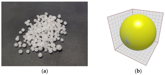 The test object of this study was urea granular fertilizer containing 46.4% N produced by Shihezi Voda Agricultural Technology Co., Ltd. (Shihezi, China). with 93.6% sphericity. Urea particles are bulk materials, and the motion in the simulation test is a bulk motion process [15]. For analytical calculations using discrete element simulation software, the Hertz-Mindin no-slip contact model [16] can be used to simulate the interaction among urea particles and between the urea particles and the fertilizer discharge device because there is almost no adhesion on the fertilizer surface.