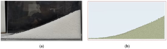 Because contact parameters such as the static friction coefficient and rolling friction coefficient significantly affect the repose angle [29], to obtain accurate friction coefficients, this paper subsequently uses the measured values of physical tests as the basis to select the range of values of the simulation test parameters. The repose angle is used to simulate and calibrate the friction coefficient.