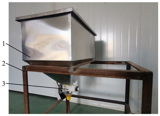 As shown in Figure 13, the fertilizer discharge bench test was conducted on the assembled variable fertilizer discharger test bench in the laboratory of Shihezi University (Shihezi, China), which mainly consisted of a fertilizer tank, an electric variable fertilizer discharger and a mounting frame. The test urea samples were from the same batch as the above tests, and the test environment temperature was 25 ± 1 °C. The fertilizer discharger was an electric variable fertilizer discharger manufactured by Shihezi Voda Agricultural Science (Shihezi, China), made of PVC plastic, with a speed of 60 r/min during the test.