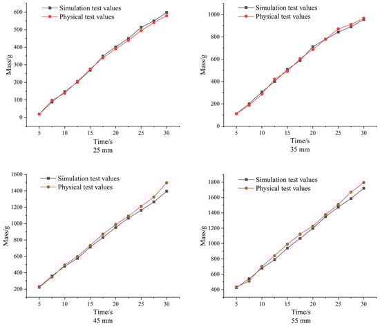 From the Figure 14, it can be seen that the maximum relative error between the simulation and physical test fertilizer discharge is 3.69% when the working length is 25 mm; the maximum relative error between the simulation and physical test fertilizer discharge is 3.39% when the working length is 35 mm; the maximum relative error between the simulation and physical test fertilizer discharge is 6.86% when the working length is 45 mm; the maximum relative error between the simulation and physical test fertilizer discharge is 4.95% when the working length is 55 mm. The maximum relative error between the simulated and physical test fertilizer discharge was 6.86% at 45 mm opening and 4.95% at 55 mm opening. The results indicate that the calibrated values of urea particle simulation parameters in this study are reliable.