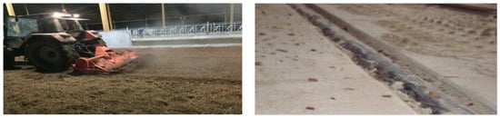 Wood chips and sawdust, among other materials, are used to develop the bedded-pack of, on average, 15 m2 per cow with a rather wide variation between countries [2,3,4]. The pack is mechanically aerated by use of a tractor with tillers. Additional aeration is provided by pipes installed to stimulate the composting process [3]. In spring, the exhausted pack material is transported and superficially spread on the land (Figure 4).