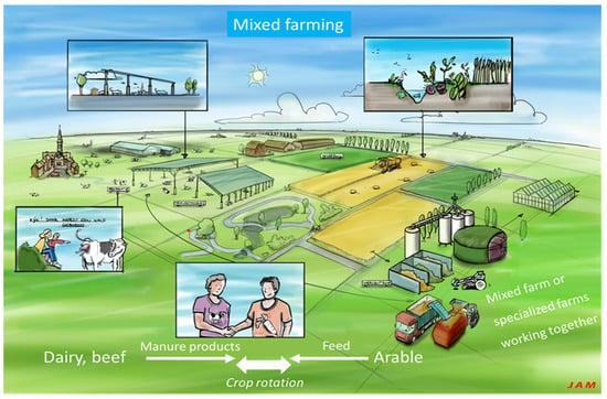One such a system involves closing the mineral loop by the exchange of materials and manure, and by the better use of manure (Figure 7). The mixed farming system fits this concept [19]. For instance, crop farming allows the composted materials to be incorporated into the soil. Collaboration on a local level will also play a crucial role in integrating different farming resources together with crop and livestock farmers, as illustrated in Figure 7.