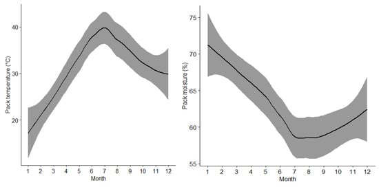Development of the average and range in temperature (left) and the moisture content (right) at 20 cm deep in 22 composting bedded-pack’s over the year. Source: Taken from Leso, L., 2021 [22].