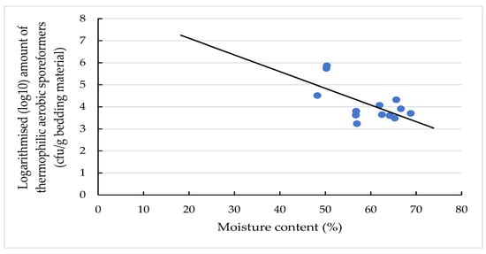 Relationship between thermophilic bacteria and moisture content in composting bedding material; y = −0.08x + 8.62 (R2 = 0.34). Source: Taken from Giambra et al., 2021 [23].