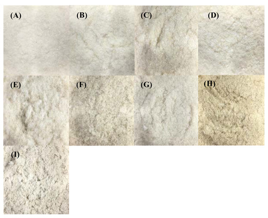 The appearance of chia seed mucilage powders extracted with different combinations of ultrasound and heat. (A) Heat-50°C/30 min; (B) Heat-50 °C/60 min; (C) Heat-80 °C/30 min; (D) Heat-80 °C/60 min; (E) Heat/Ultrasound-50 °C/30 min; (F) Heat/Ultrasound-50 °C/60 min; (G) Heat/Ultrasound-80 °C/30 min; (H) Heat/Ultrasound-80 °C/60 min; (I) Heat/Ultrasound-50 °C/60 min with purification.