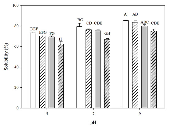 The solubility of chia seed mucilage extracted by ultrasound in combination with heat at different pH. Error bars represent standard deviations. Means with different superscript capital letters denote significant difference (p < 0.05). (