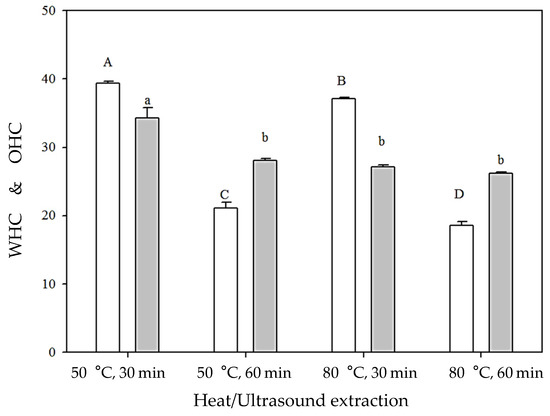 ) of chia seed mucilage extracted by ultrasound in combination with heat. Error bars represent standard deviations. Means with different superscript capital letters and lowercase letters denote significant difference among WHC and OHC (p < 0.05), respectively.