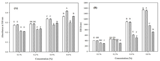 The (A) absorbance at 500 nm and (B) emulsifying stability index (ESI) of chia seed mucilage extracted by ultrasound in combination with heat at different concentrations. Error bars represent standard deviations. Means with different superscript capital letters denote significant difference (p < 0.05). (