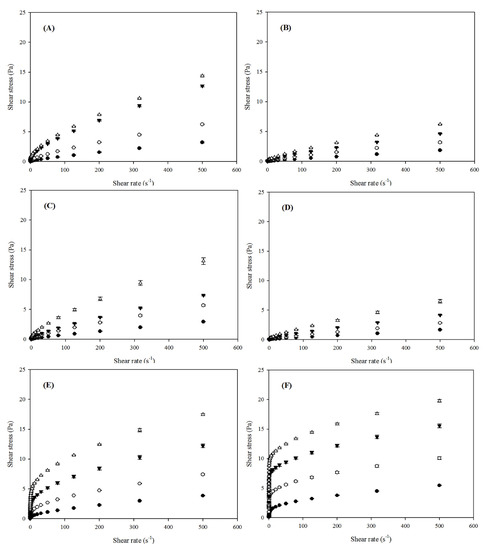 Shear stress as a function of shear rate for different concentrations of xanthan gum and chia seed mucilage extracted by ultrasound in combination with heat. (A) Heat/Ultrasound-50 °C/30 min; (B) Heat/Ultrasound-50 °C/60 min; (C) Heat/Ultrasound-80 °C/30 min; (D) Heat/Ultrasound-80 °C/60 min; (E) Heat/Ultrasound-50 °C/60 min with purification; (F) xanthan gum. Error bars represent standard deviations (● 0.25%, ○ 0.5%, ▼ 0.75%, △ 1%).