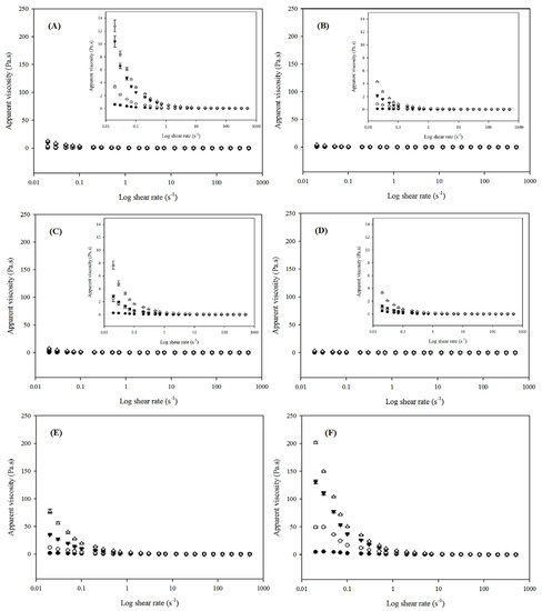 Apparent viscosity as a function of shear rate for different concentrations of xanthan gum and chia seed mucilage extracted by ultrasound in combination with heat. (A) Heat/Ultrasound-50 °C/30 min; (B) Heat/Ultrasound-50 °C/60 min; (C) Heat/Ultrasound-80 °C/30 min; (D) Heat/Ultrasound-80 °C/60 min; (E) Heat/Ultrasound-50 °C/60 min with purification; (F) xanthan gum. Error bars represent standard deviations (● 0.25%, ○ 0.5%, ▼ 0.75%, △ 1%).