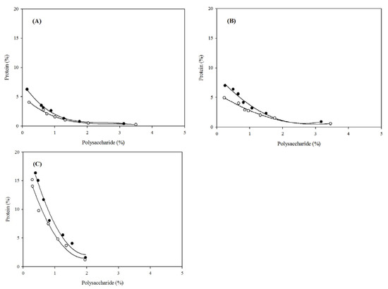 Phase diagram of binary mixtures of chia seed mucilage (● unpurified, ○ purified) and different proteins: (A) soy protein isolate, (B) sodium caseinate, (C) whey protein isolate. The points in the figure are experimental values. The line is the predicted value of Y in the equation of Y = Y0 + A × exp(−R0×X). The values of Y0, A, R0, and determination coefficient are shown in Supplementary.