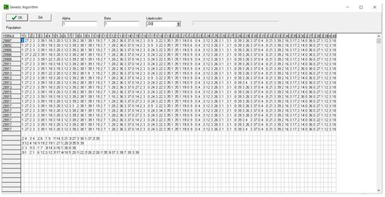 As expected, with a higher run number and more agents, the average run result yielded a better target than a lower run number or fewer agents. However, the lowest aggregate target value was obtained from the lower run increments. On the contrary, the average target value was close to 1.5% lower for the higher runner step [4]. It was clear that the process did not converge, as can be seen in the examples. Only in the case of a high number of agents and a long run, or an evaporation factor proportional to the maximum path length, could a relatively low target value be found. A detailed examination was unnecessary since, in the examined samples (about 1000 runs), we found that the solution obtained could be very different at the same parameter value. Thus, it was found that usage of the ant algorithm primarily provided good ground for pre-processing other processes. Therefore, we will use the more efficient and verifiable convergent GA solution to play a role in pre-processing [6]. Accordingly, the solutions provided by the ant algorithm form the initial population of the GA. This is positive from the point of view of good-quality initial chromosomes, and, from experience, it is also beneficial that each individual is relatively distant from the other.