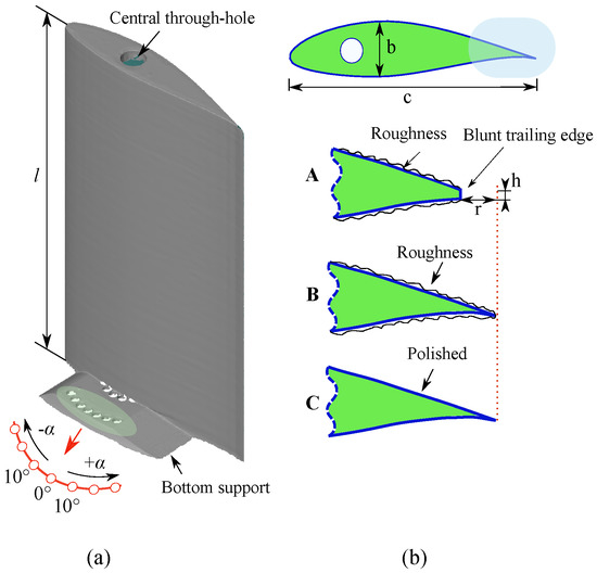 The general view of the airfoil design is presented in Figure 1a. The angle of attack was changed by turning the airfoil relative to its central through-hole. Then, the set position was fixed by mounting holes of the lower support. Each mounting hole changed the value of the angle by .
